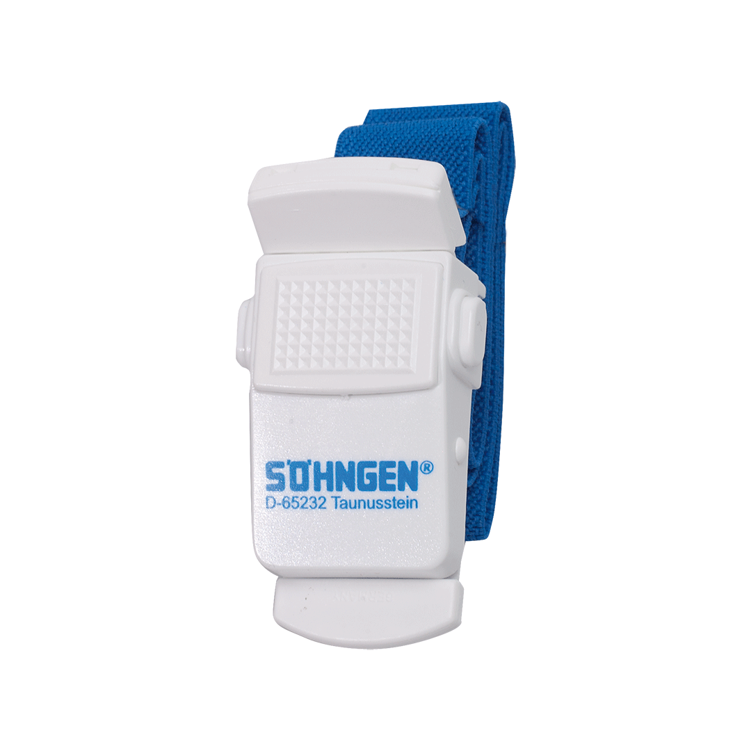 Elastisk bånd, blå, sikkerhetsfeste av plast: løsne først, så åpne. Enhåndsoperasjon.
